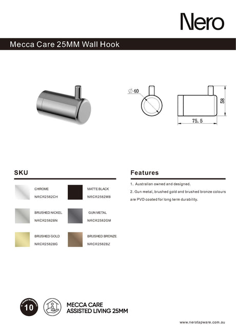 $82.00$110.00Unit price /UnavailableNero Mecca Care 25mm Wall Hook Brushed Gold NRCR2582BG