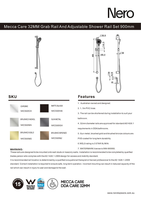 $362.00$484.00Unit price /UnavailableNero Mecca Care 32mm Grab Rail And Adjustable Shower Rail Set 900mm Chrome NRCS005CH