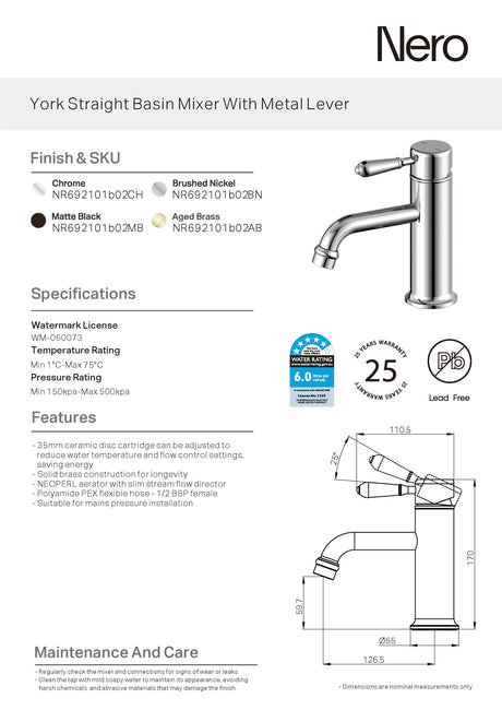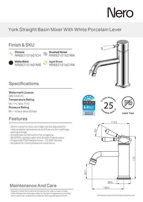 $226.00$302.60Unit price /UnavailableNero York Straight Basin Mixer w/White Porcelain Lever Chrome NR692101B01CH