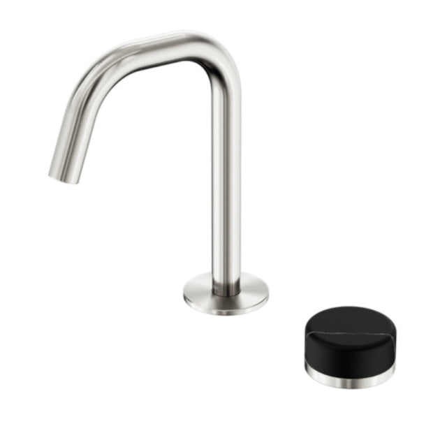 The Nero Serenity Progressive Basin Mixer Arc Spout features an elegant arc spout with 180-degree swivel, making it easy to move water flow across the basin for rinsing or cleaning while maintaining a refined, slim profile.