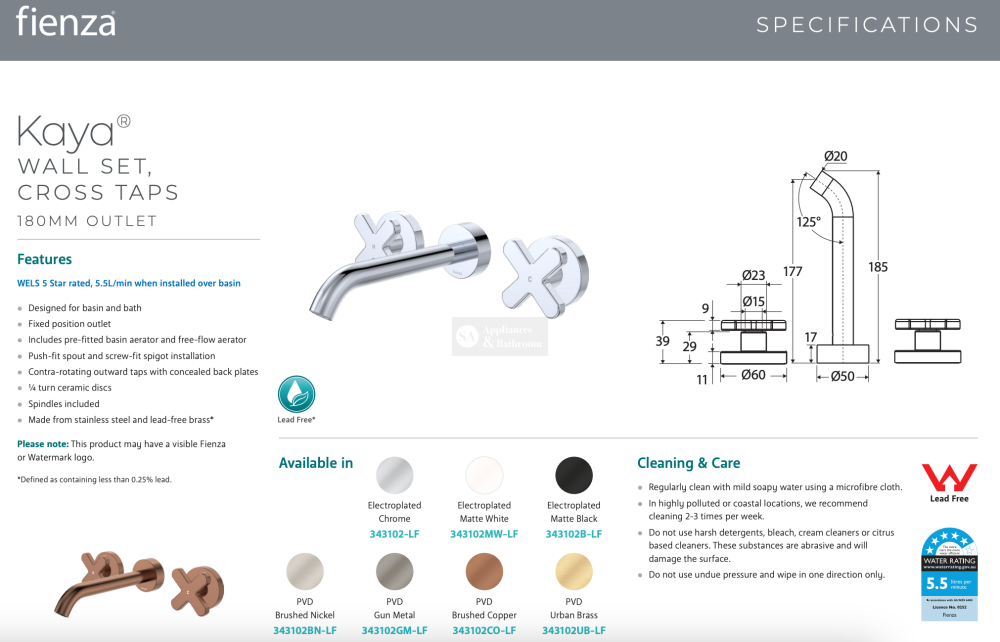 WELS 5 Stars rated, 5.5L/min when installed over basin