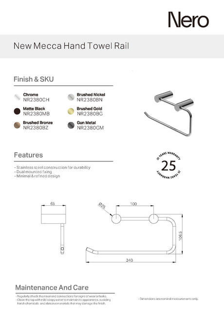 $57.00$77.00Unit price /UnavailableNero Mecca Hand Towel Rail Chrome NR1980aCH