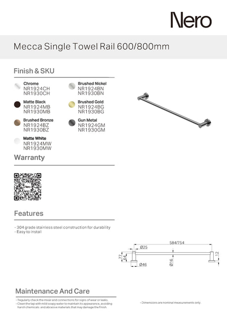 $65.00$78.00Unit price /UnavailableNero New Mecca Single Towel Rail 600mm Chrome NR2324CH