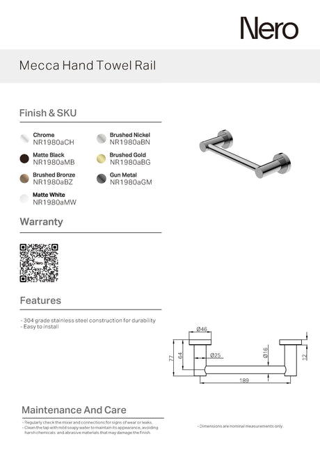 $65.00$88.00Unit price /UnavailableNero Mecca Hand Towel Rail Brushed Nickel NR1980aBN