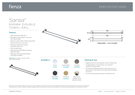 $200.00$237.00Unit price /UnavailableFienza Sansa Double Towel Rail 900mm 83208UB - Urban Brass