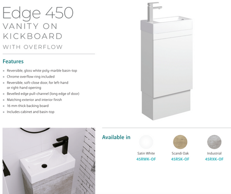 $488.00Unit price /UnavailableFienza Edge 45RWK-OF Satin White 450mm Vanity with Kickboard, With Overflow