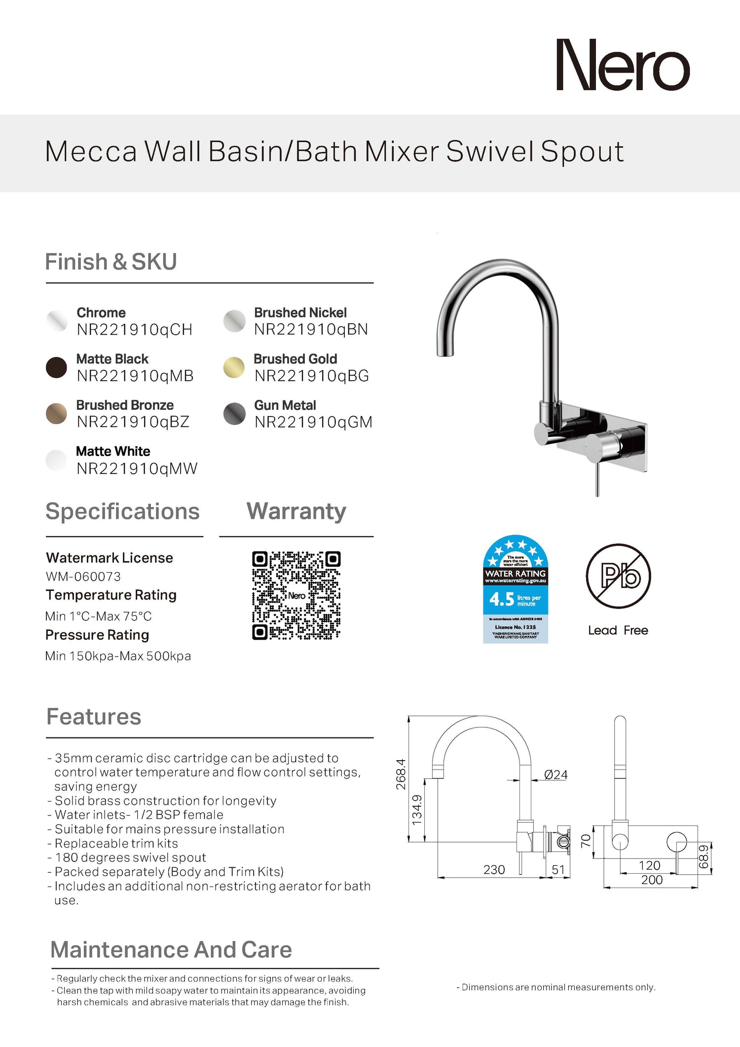Nero Mecca Wall Basin/Bath Mixer Swivel Spout Brushed Gold NR221910QBG
