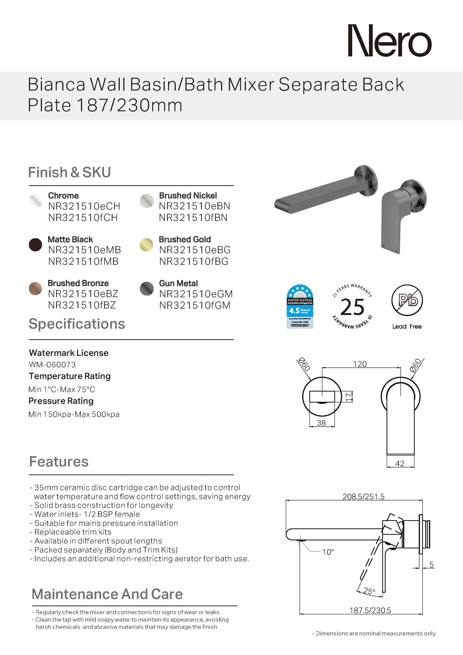 Nero Bianca Wall Basin/Bath Mixer 187mm Separate Back Plate Chrome NR321510ECH is backordered and will ship as soon as it is back in stock.
