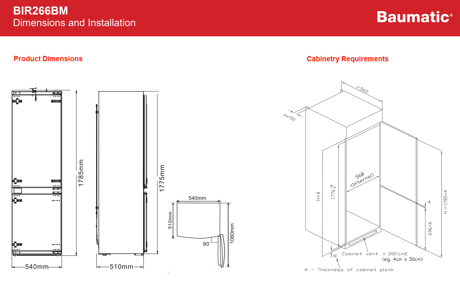 Baumatic BIR266BM 266L Bottom Mount Integrated Refrigerator