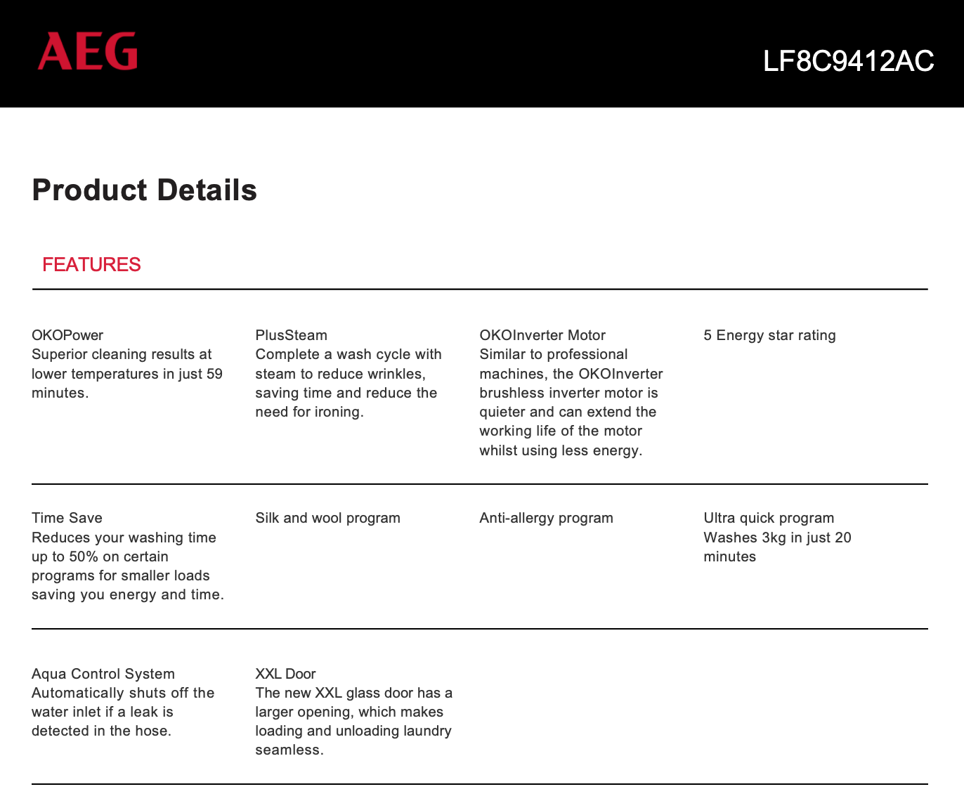AEG LF8C9412AC 9KG 8000 Series Front Load Washing Machine