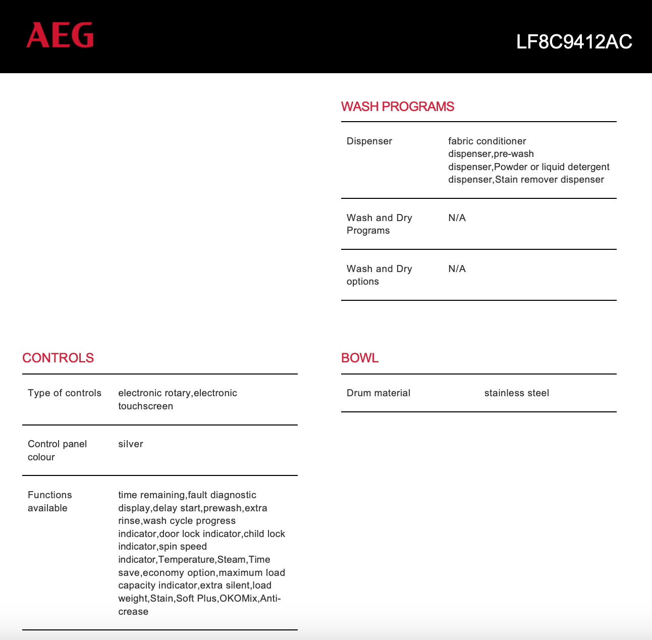 AEG LF8C9412AC 9KG 8000 Series Front Load Washing Machine - Factory Seconds is backordered and will ship as soon as it is back in stock.