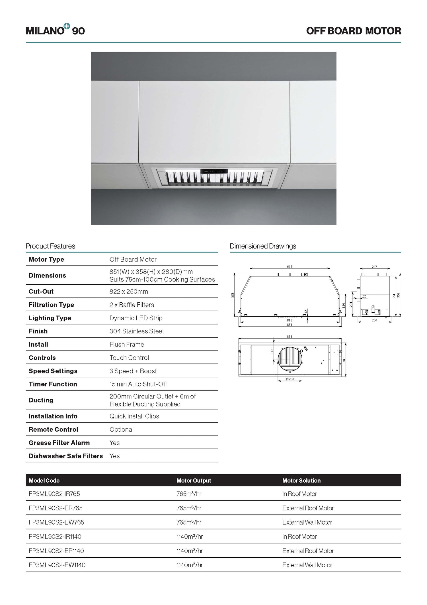 Falmec FP3ML90S2-IR1140 90cm Milano+ Undermount Rangehood with Internal Roof Motor