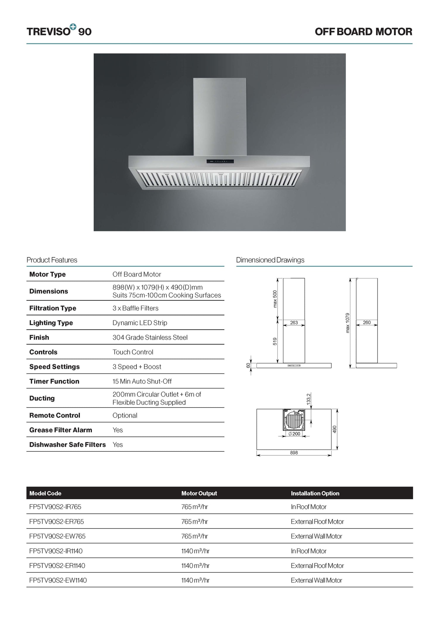 Falmec FP5TV90S2-EW1140 90cm Treviso+ Wall Canopy Rangehood with External Wall Motor