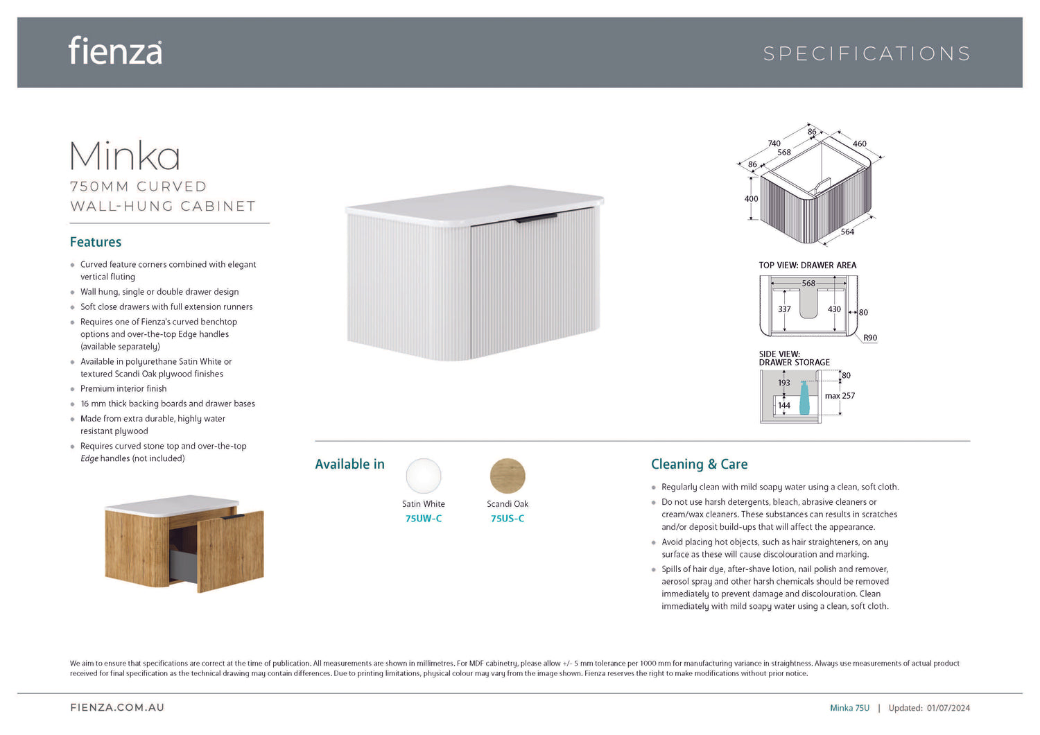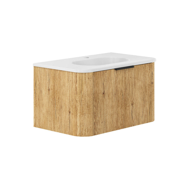 Fienza LOL75US Lola 750 Matte Minka Curved Scandi Oak Wall-Hung Vanity, One Tap Hole