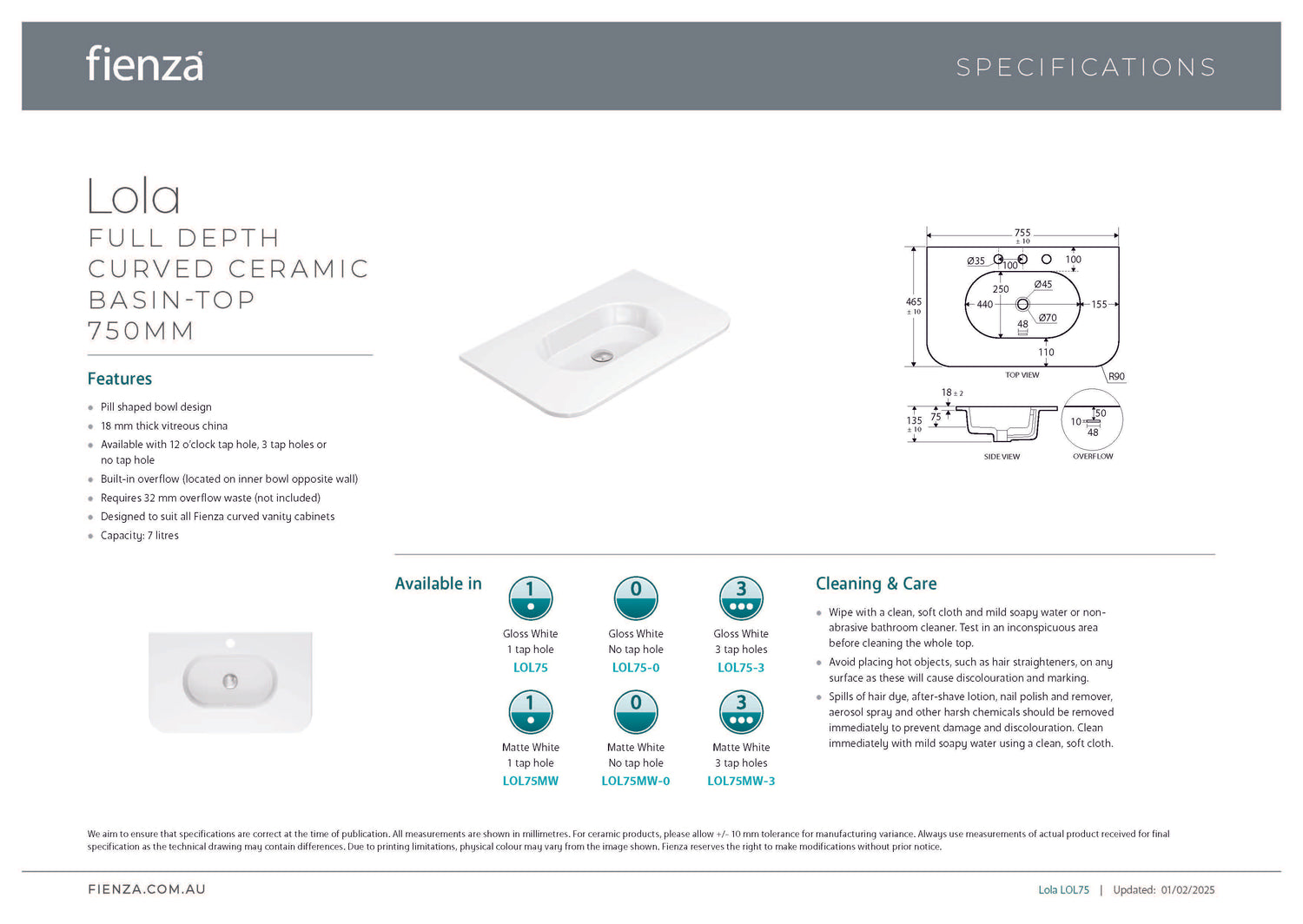- Available with 12 o’clock tap hole, 3 tap holes or no tap hole (3 tap holes incurs additional cost: RRP $50)