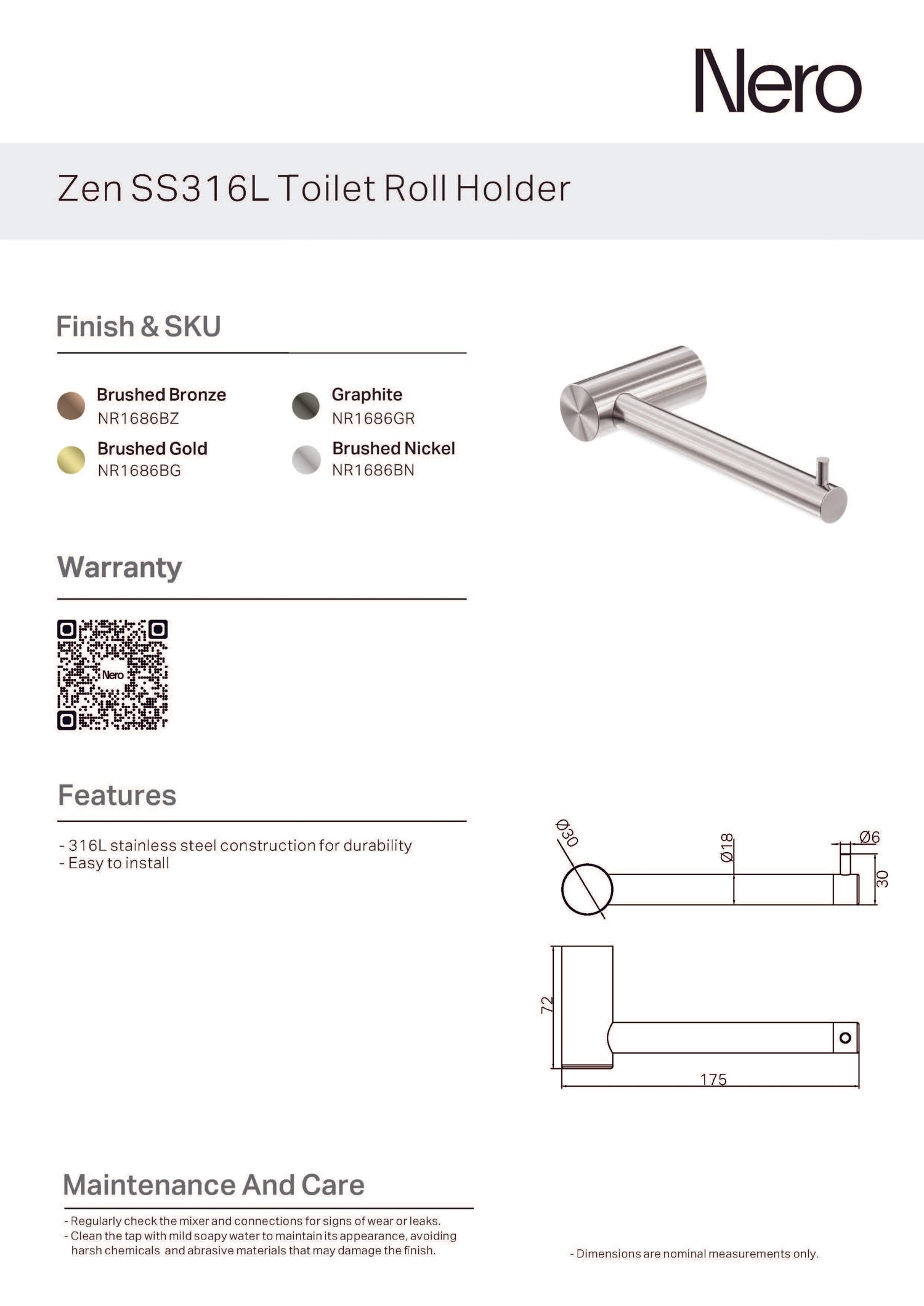 Nero Zen SS316L Toilet Roll Holder is available in Brushed Nickel, Brushed Gold, Graphite and Brushed Bronze finishes.