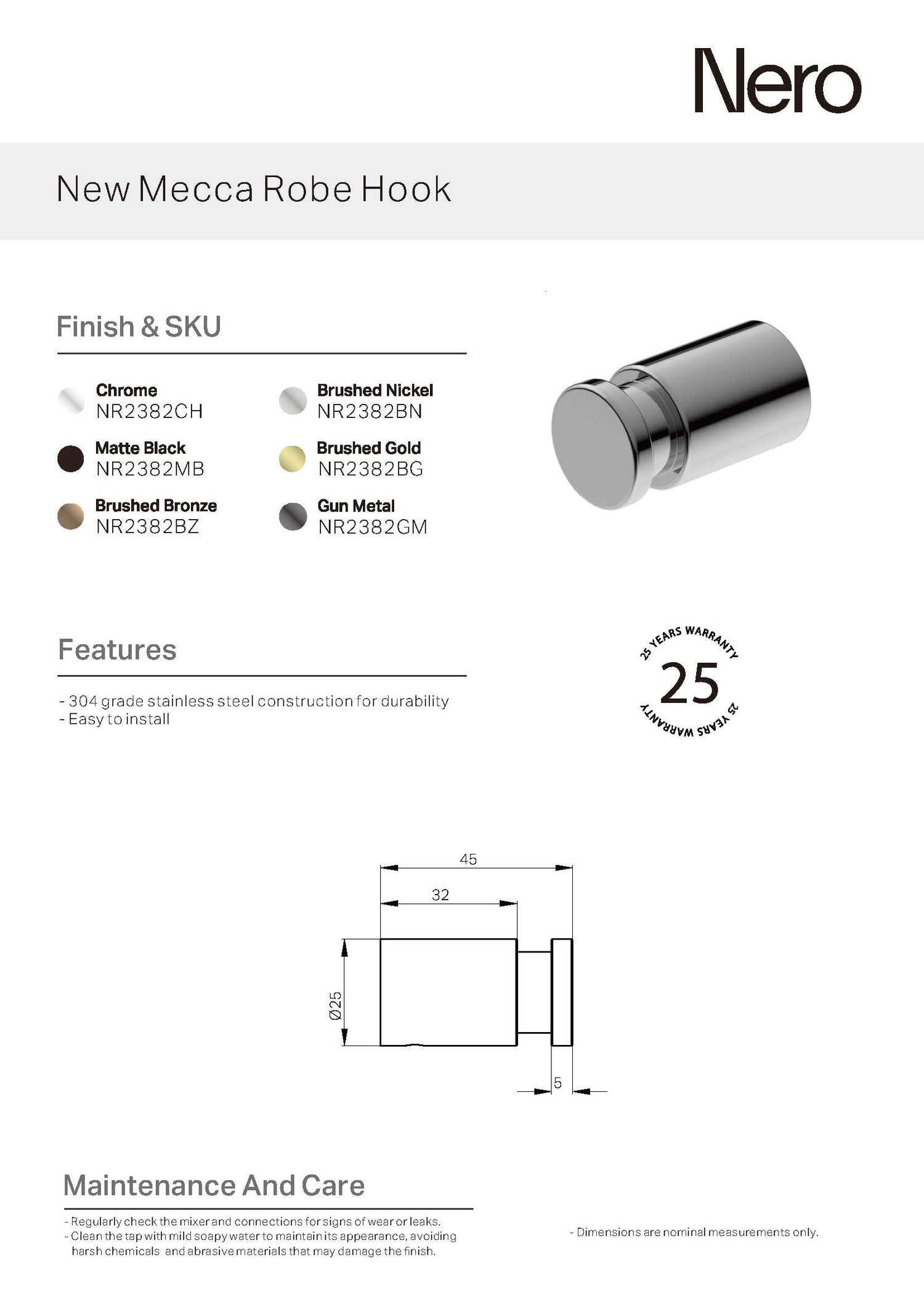Nero New Mecca Robe Hook offers a minimalist design structure and promotes Mecca’s style and simplicity. The products feature a demonstration that embodies elegance and artistic temperament, matching the current bathroom space design trend perfectly.