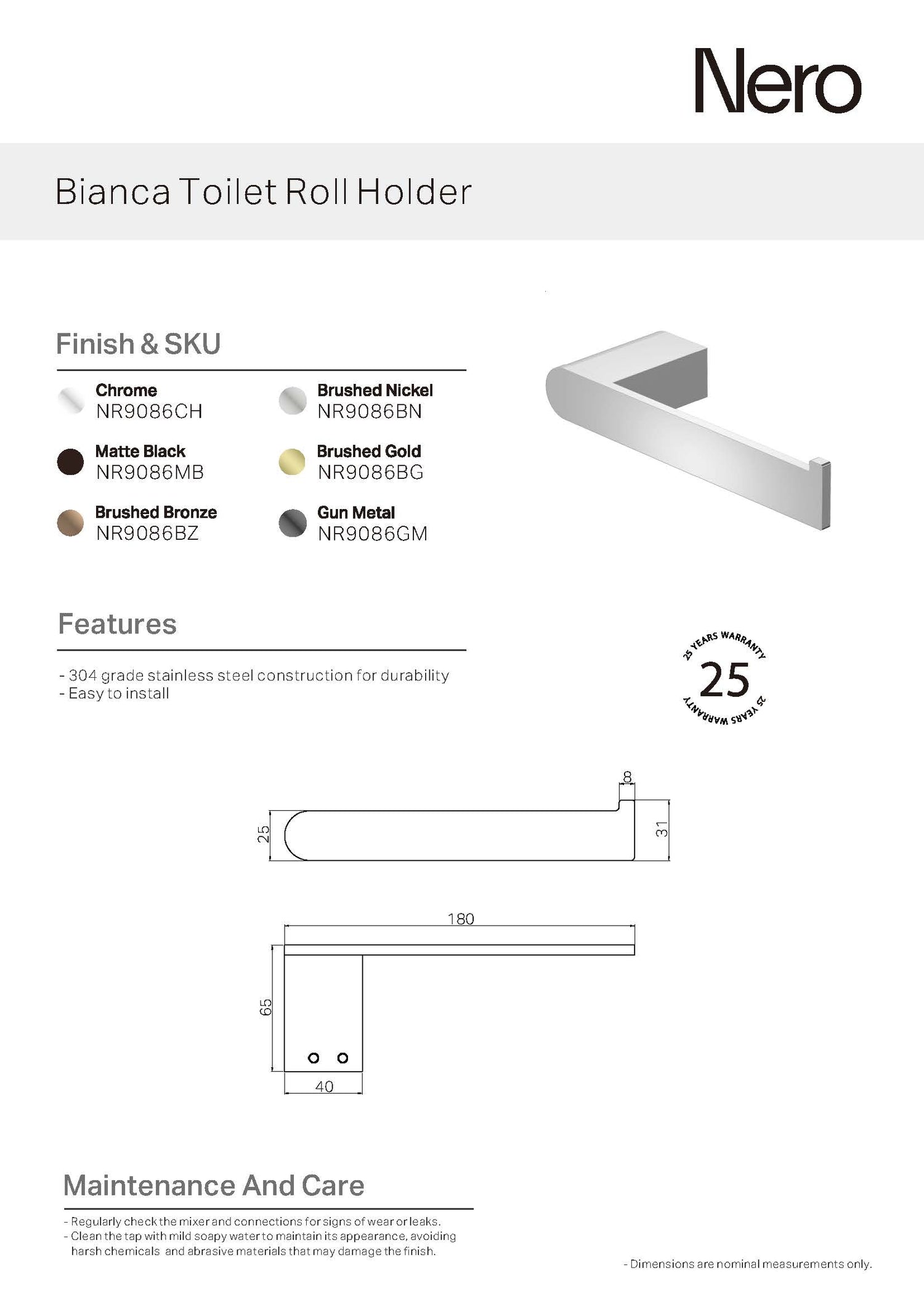 Nero tapware and accessories are made to the highest industry standards and are of high quality. 304 Grade Stainless steel construction for durability. It’s very easy to install and has high-quality finishes with an elegant design to complement any contemporary space. It also has matching tapware and accessories to complete the look for that perfect touch.