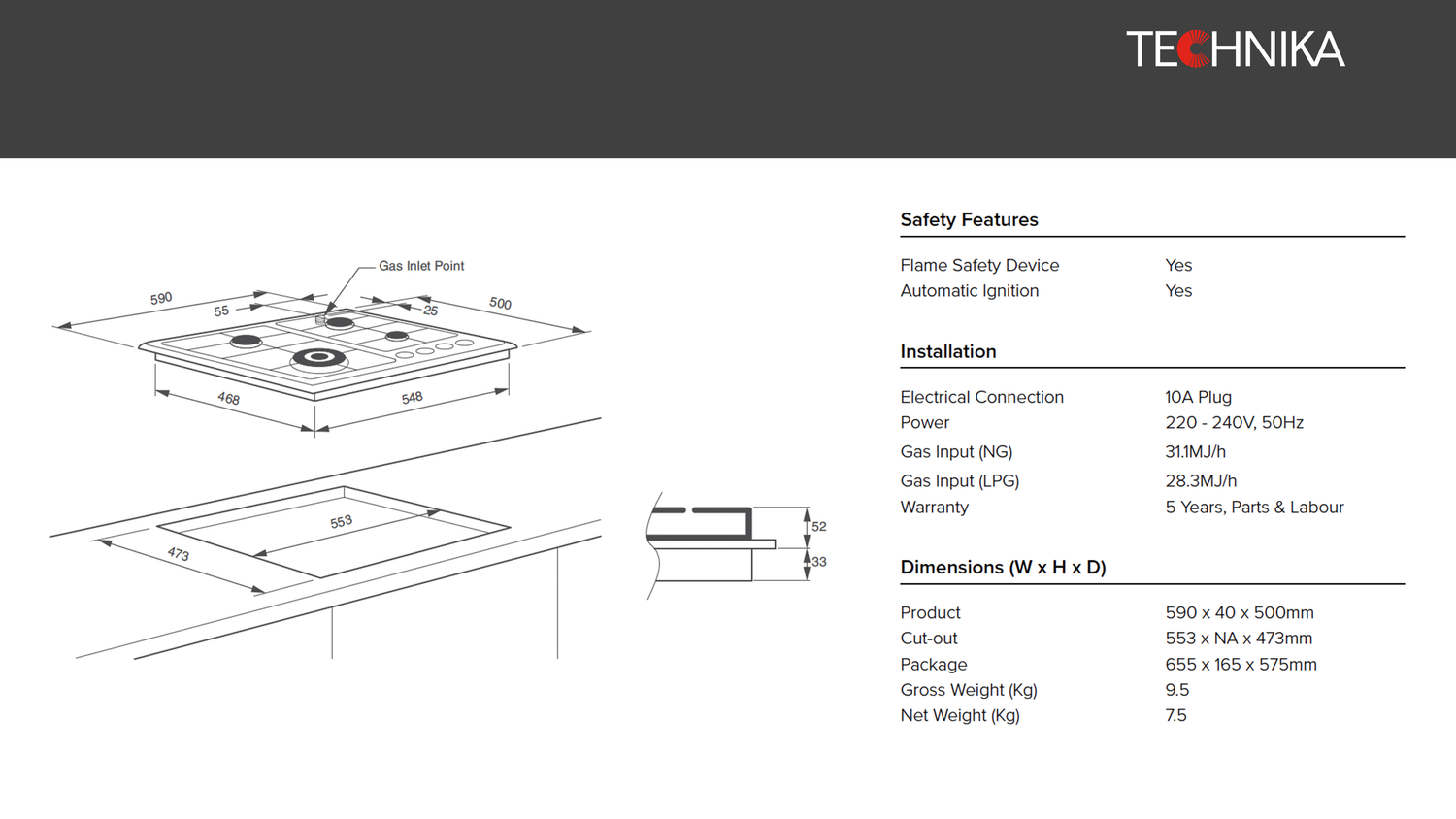 Cutout: Width: 553mm x Depth: 473mm